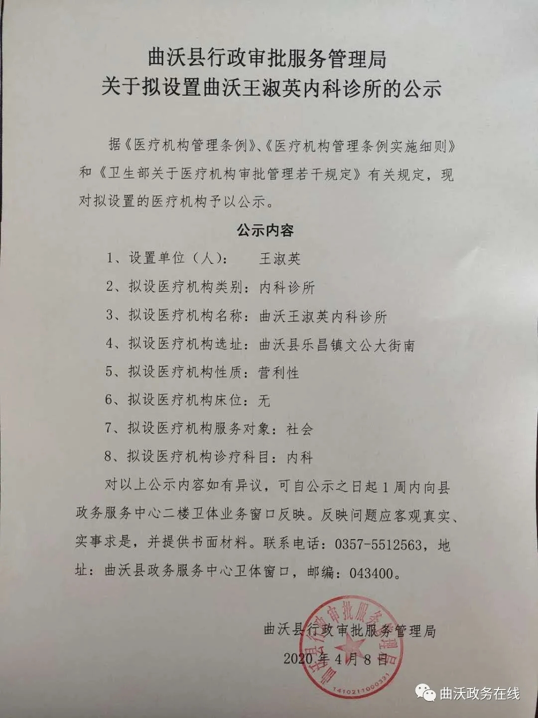 關于擬設置曲沃王淑英內科診所的公示