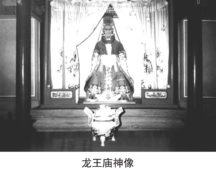 數(shù)日功夫,龍王廟建成了,它坐北向南,依山傍水,規(guī)模宏大,氣勢磅礴,廟中最北邊有正殿五間,前有獻殿三間,中有過廳五間,南有戲臺一座,戲臺兩邊建有東西兩個廟門,廟院中東西兩側還建走廊各十余間。龍王廟的正殿中有龍王爺塑像一座,中間兩根直通屋頂?shù)哪局嫌袃杀P木龍。建廟時,人們沒有忘記退去洪水的青龍兄弟,便把它倆的像雕成木龍,纏繞在這兩根木柱上,同龍王爺一起享受人們的祭祀。大殿東西兩側還塑有雷、電、火、雨、風、云、霧、雪八大金剛。塑像都有一人多高,身涂五彩,飄衣飛帶,威風凜凜。