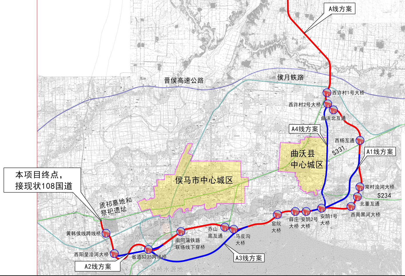 該項(xiàng)目起點(diǎn)位于襄汾縣鄧莊鎮(zhèn)梁坡村東側(cè)與原G108順接,路線由北向南布設(shè),途經(jīng)襄汾縣鄧莊鎮(zhèn)、新城鎮(zhèn),曲沃縣里村鎮(zhèn)、曲村鎮(zhèn)、高顯鎮(zhèn)、史村鎮(zhèn)、北董鄉(xiāng),侯馬市鳳城鄉(xiāng)、上馬街道辦事處、高村鄉(xiāng),終點(diǎn)位于侯馬市高村鄉(xiāng)西賀村北側(cè)與原G108相接,路線全長67.54千米。占地面積共434.05公頃,其中新增用地367.31公頃,舊路用地66.74公頃。新增建設(shè)用地中包含主線用地196.05公頃,互通用地144.09公頃,沿線設(shè)施用地27.17公頃(其中襄汾過城市段道路按市政設(shè)施標(biāo)準(zhǔn)預(yù)留,本次規(guī)劃中未計(jì)入)。