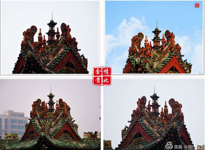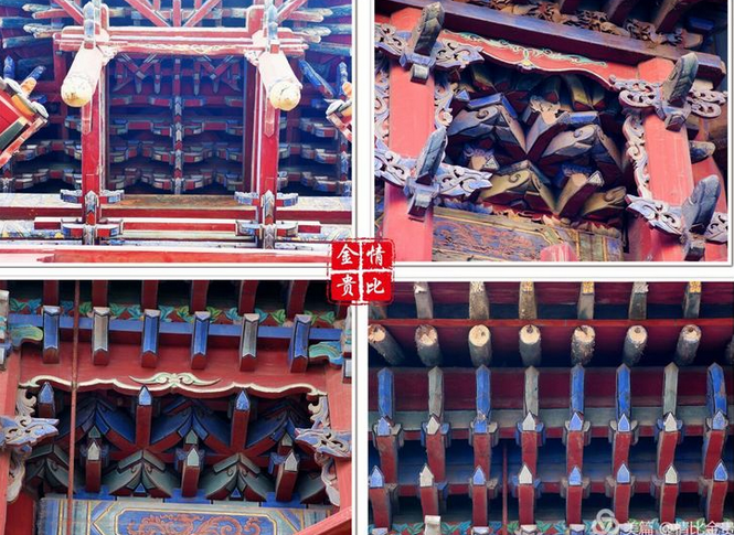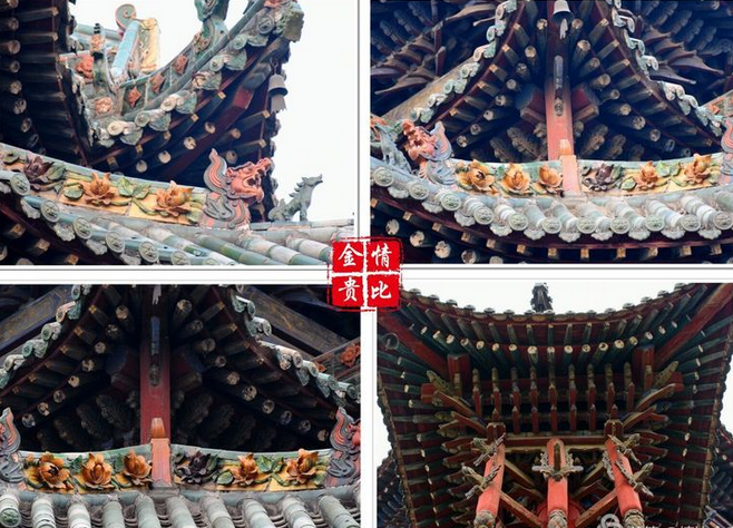 四牌樓建筑結(jié)構(gòu)為三重檐三層樓身,一、二層四面均面闊三間,進深三間。四牌樓造型奇待,為樓閣式與牌樓式相結(jié)合結(jié)構(gòu),牌坊上下坊,雀替,板件上雕有精美的淺浮雕塑,有較高的藝術(shù)價值。邊樓在額枋與柱上出穿插枋,出抱廈,使其檐突出圍檐,利用視覺原理,造成又一層疊檐的假象。三層檐利用很小空間,設(shè)置十字歇山頂,合理平衡層頂與出檐重。