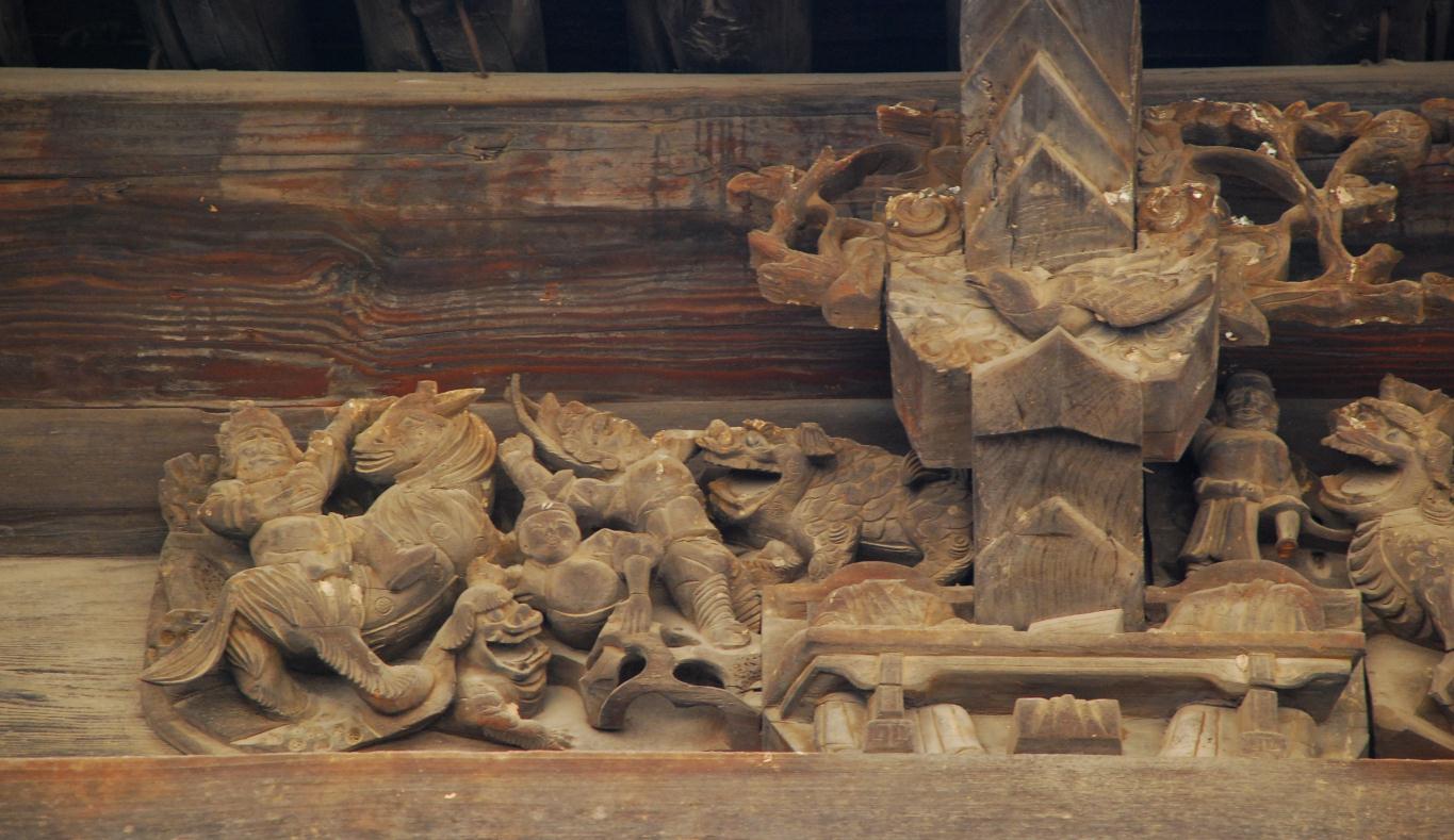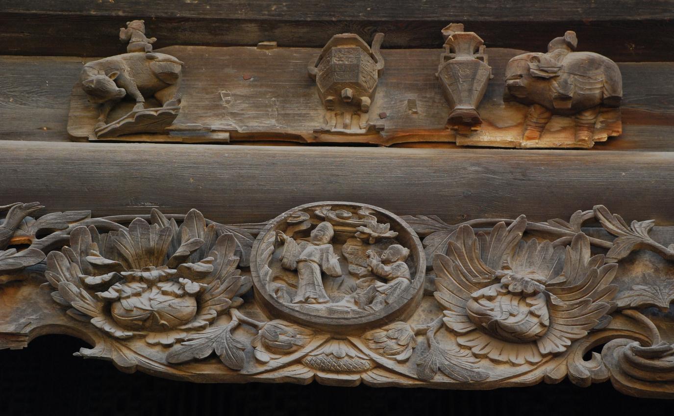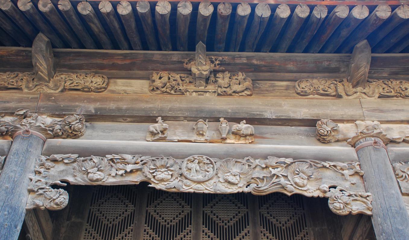 下院清代民居,位于楊談鄉(xiāng)下院村。據(jù)樑脊板記載:建于清代嘉慶四年(1799),民宅座北向南,面闊三間,進(jìn)深一間,附屬影壁一座,占地面積108平方米。兩個大樑上有六朵垂花,有橫有昂,南北兩側(cè)有磚刻,保存完整。