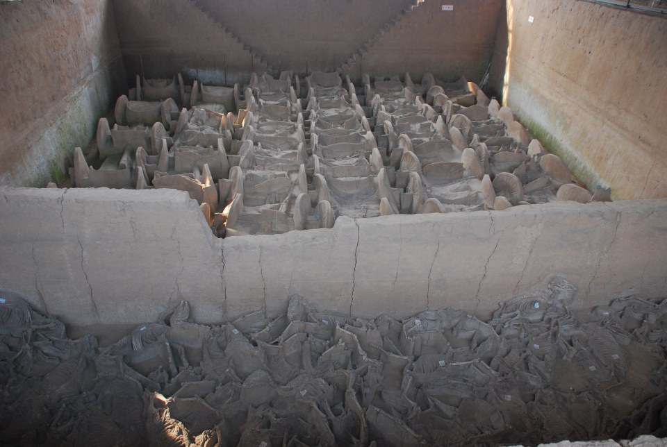 在這九代十九座晉侯及夫人墓中,8號、31號晉獻侯蘇賠葬車馬坑最具代表性,至2010年,它是國內(nèi)發(fā)現(xiàn)西周時期最大的陪葬車馬坑,東西長211米,南北寬15米。該坑開始發(fā)掘于1992年,坑內(nèi)東部為馬,西部為車,中間有寬0.45米的隔梁。共清理出活葬戰(zhàn)馬103匹,分三層放置。2006年3月后,由山西省考古研究所和北京大學考古文博學院聯(lián)合對1號車馬坑西部的車坑進行了發(fā)掘,約有戰(zhàn)車近60輛,其中彩繪戰(zhàn)車裝飾華美,“裝甲”戰(zhàn)車彌足珍貴、圍欄式戰(zhàn)車堪稱標車、簸箕形戰(zhàn)車造型精美,為研究西周車輛制做工藝、科技水平和軍事提供了難得的實物資料,也為后人提供了蔚為壯觀的車馬戰(zhàn)陣。